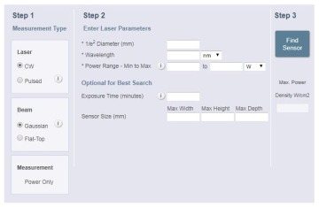 - Pro základní výběr měřicí sondy je naprosto nezbytné znát data laserového paprsku, který chcete měřit, čili u kontinuálních laserů vlnovou délku, výkon a průměr svazku v bodě měření, u pulsních laserů je nutné ještě navíc zadat maximální energii v pulsu, délku pulsu a opakovací frekvenci.