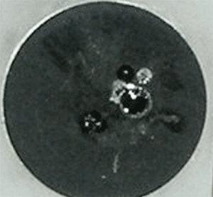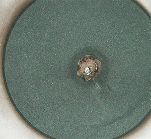 - Vždy je vhodné měřit paprsek v bodě, kde je stopa nejširší, pouze je nutné dbát na to, aby se paprsek „vešel“ do vstupní apertury měřicí sondy. U laserů středních a vysokých výkonů všeobecně platí, že stopa by neměla být příliš malá. Jde o to, že pokud je potřeba například měřit laser o výkonu 5 kW a stopa bude mít 0,5 mm, pak již pravděpodobně nedojde k měření, ale spíše k „obrábění“ absorbéru (viz obrázek poškozeného absorbéru vlivem nesprávného měření). Poškozený absorbér lze sice vyměnit, ale není to úplně levné, takže je dobré se podobných chyb vyvarovat.